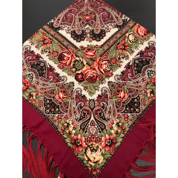 Culoare de baza:visiniu inflorat si franjuri de matase